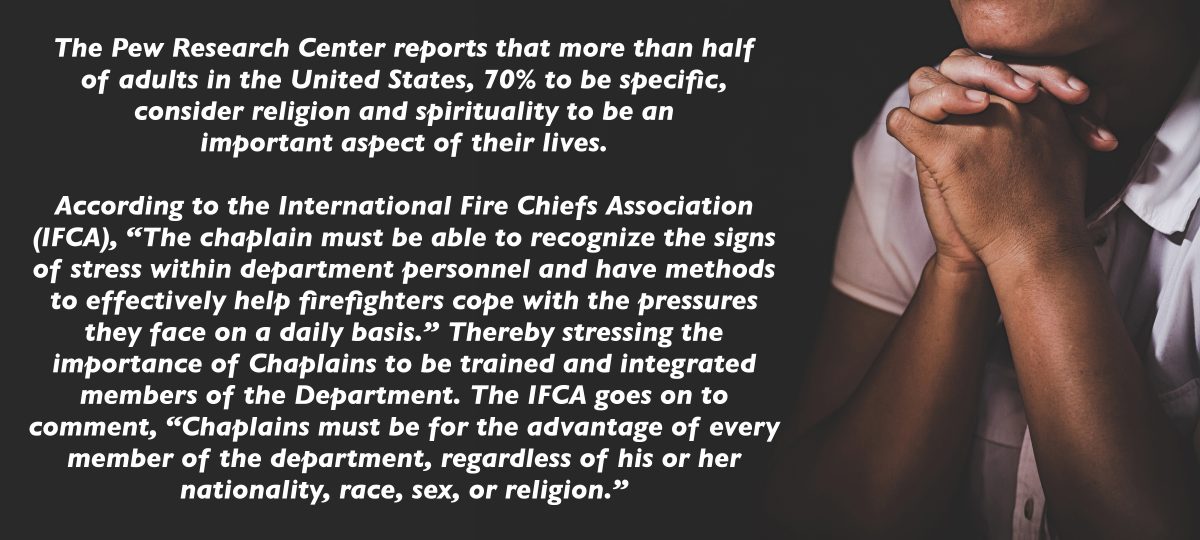 An Emergency Services Chaplain is intended to be a trusted individual who provides confidential emotional and spiritual support to firefighters and their families, especially during difficult times like critical incidents, injuries, or fatalities. Emergency Services Chaplains can offer grief counseling and religious ceremonies, while respecting diverse faiths. The Emergency Services Chaplain needs to have emotional intelligence and possess an institutional knowledge of their own religion’s spiritual traditions to reflect on and be a compassionate caregiver to others.