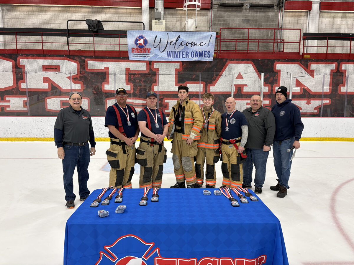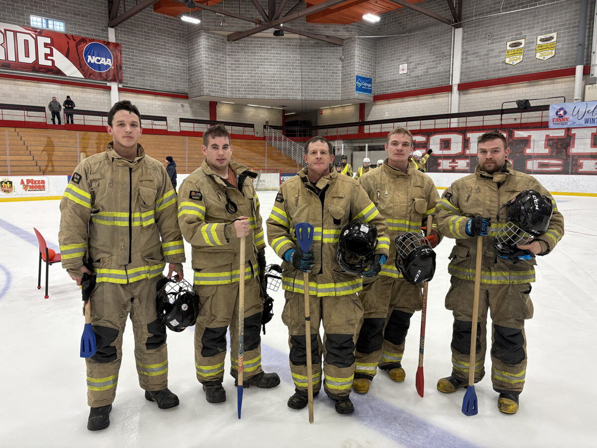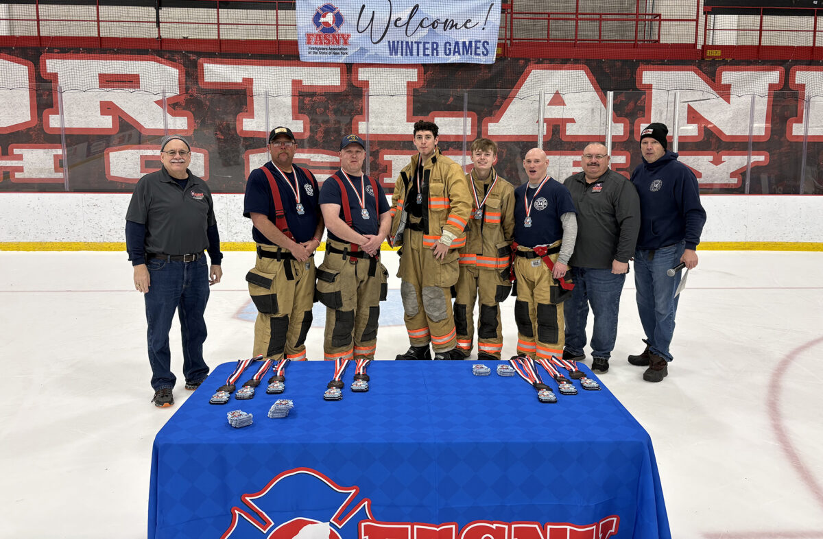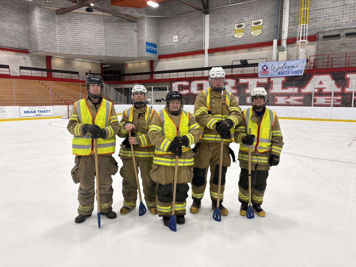 Despite snow underfoot and icy winds, 100 firefighters from 12 departments competed in a modified obstacle course, hose race, tug of war and broomball.