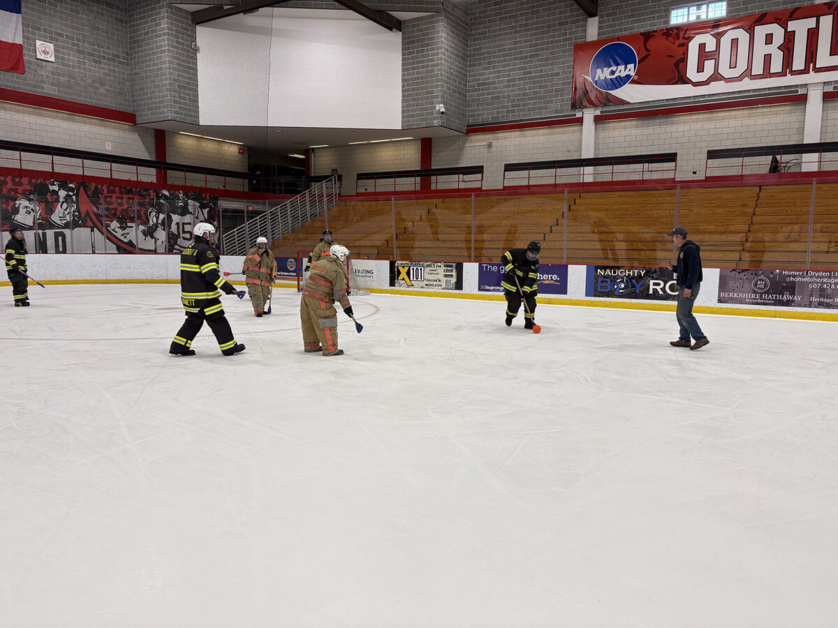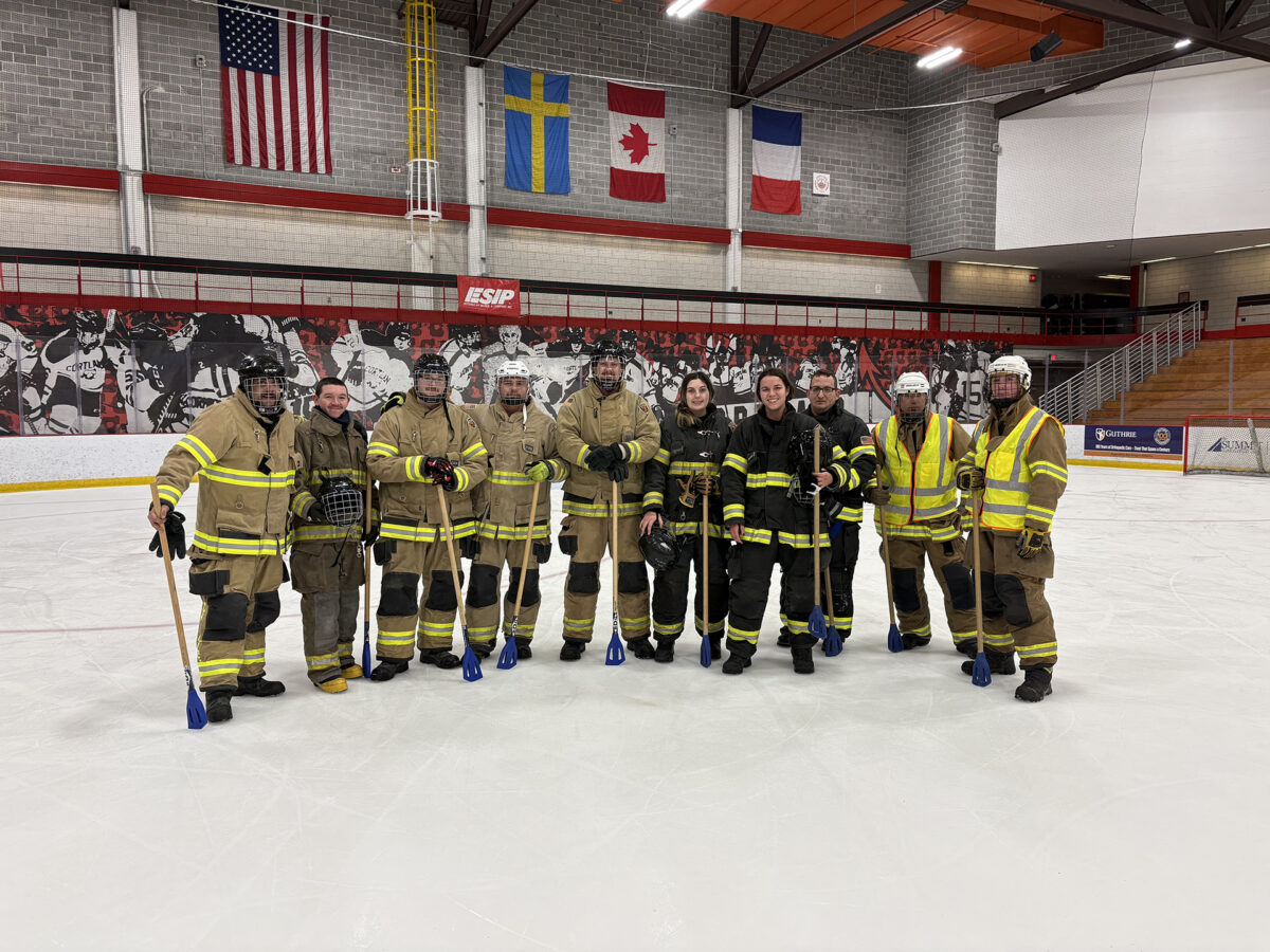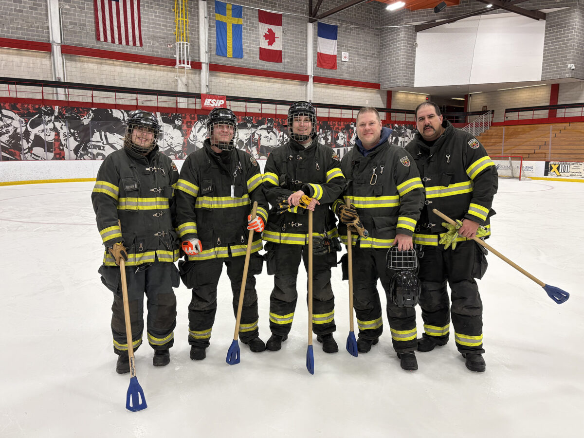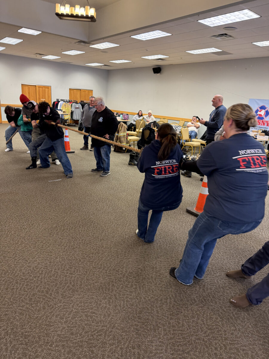Despite snow underfoot and icy winds, 100 firefighters from 12 departments competed in a modified obstacle course, hose race, tug of war and broomball.