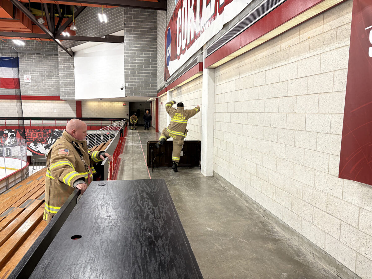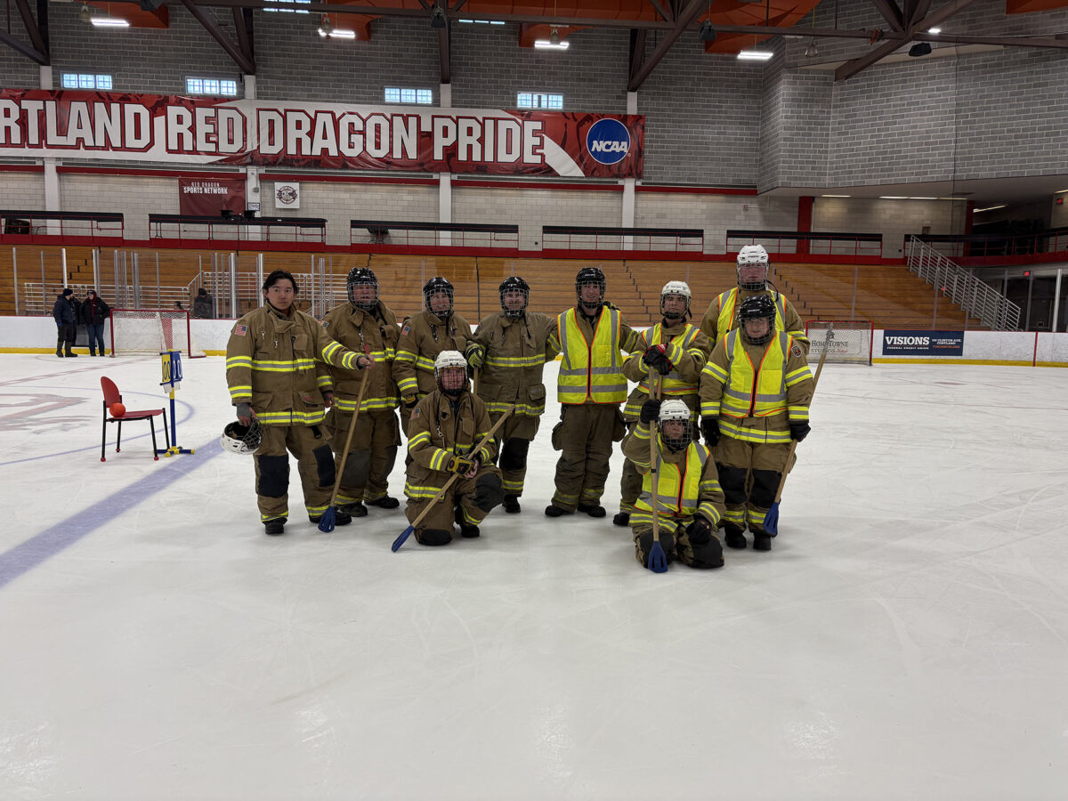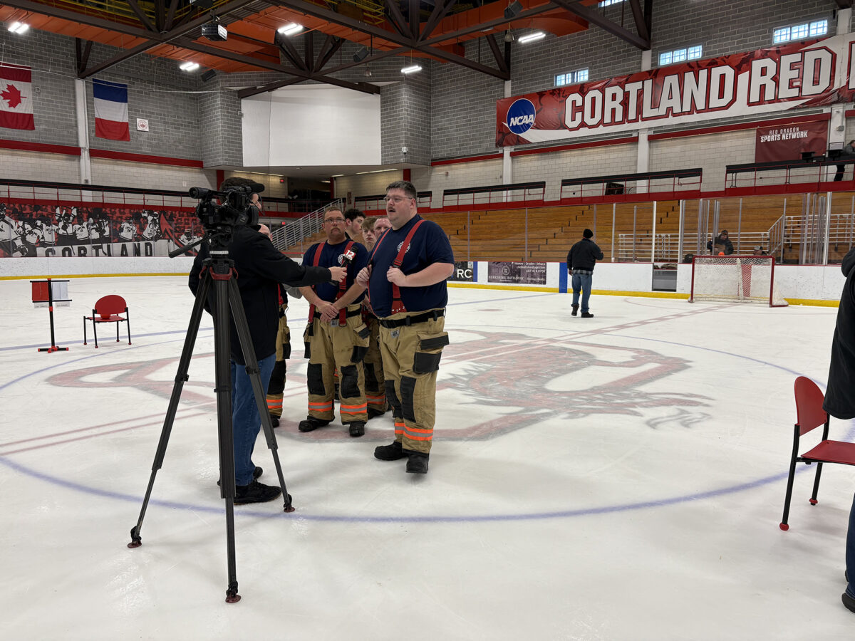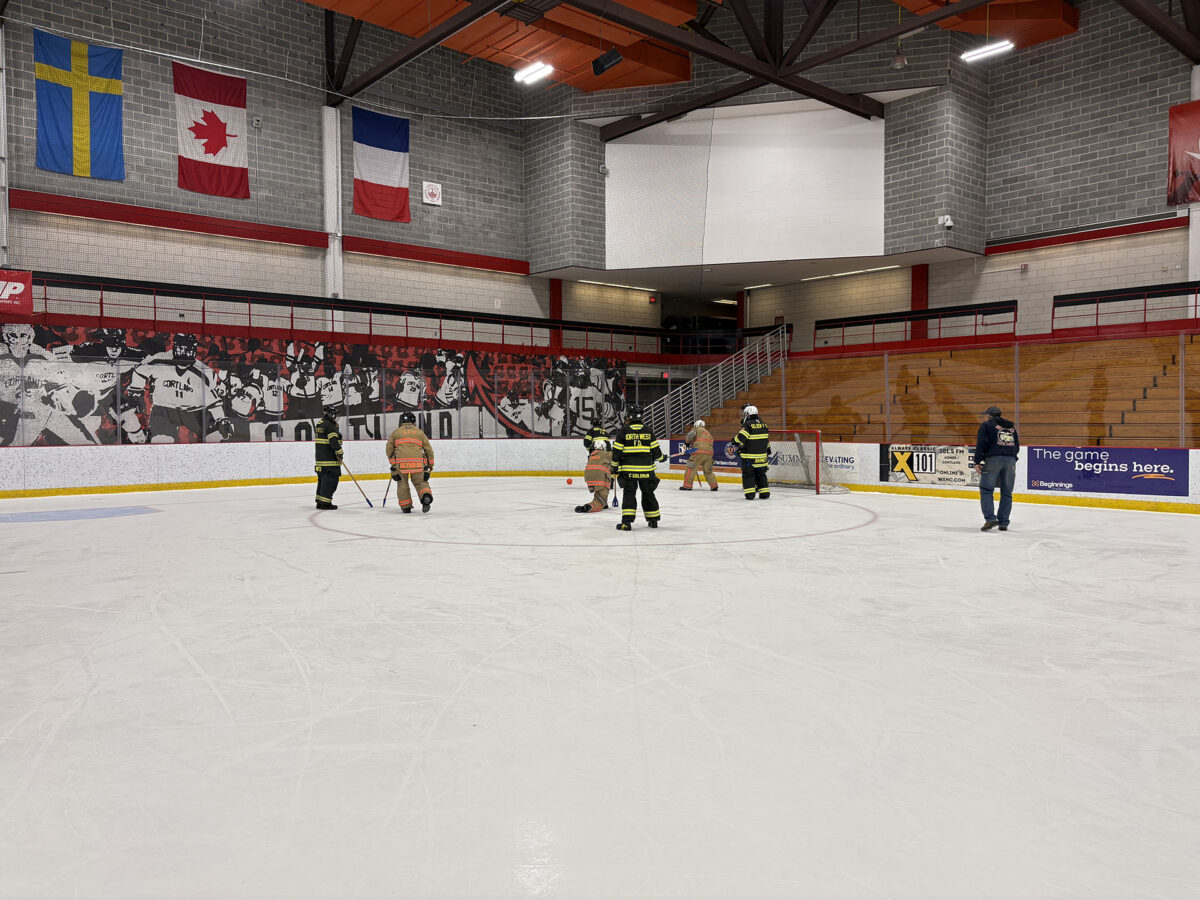 Despite snow underfoot and icy winds, 100 firefighters from 12 departments competed in a modified obstacle course, hose race, tug of war and broomball.