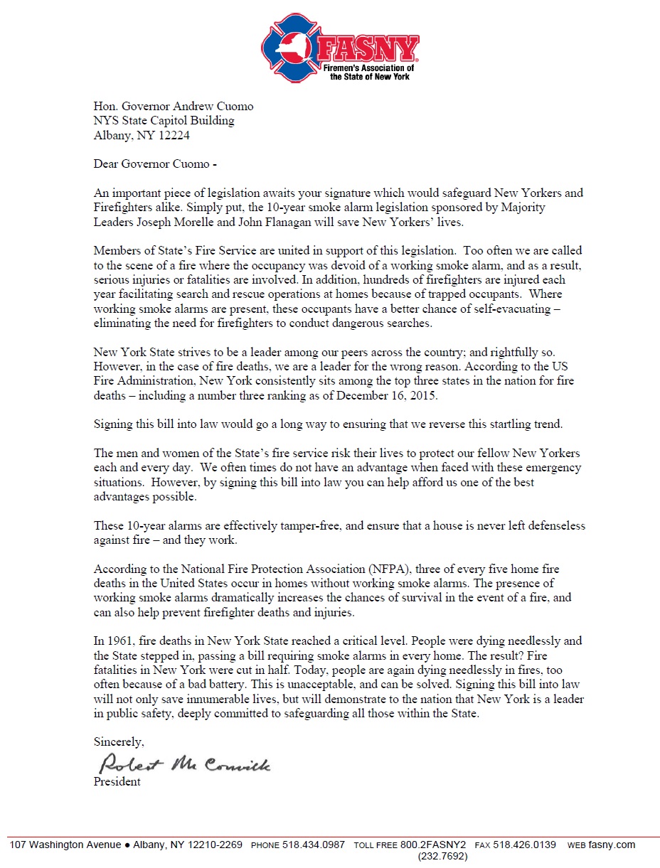 In a letter to the Governor, FASNY President Robert McConville highlight the critical importance of working smoke alarms to both civilians and firefighters alike: